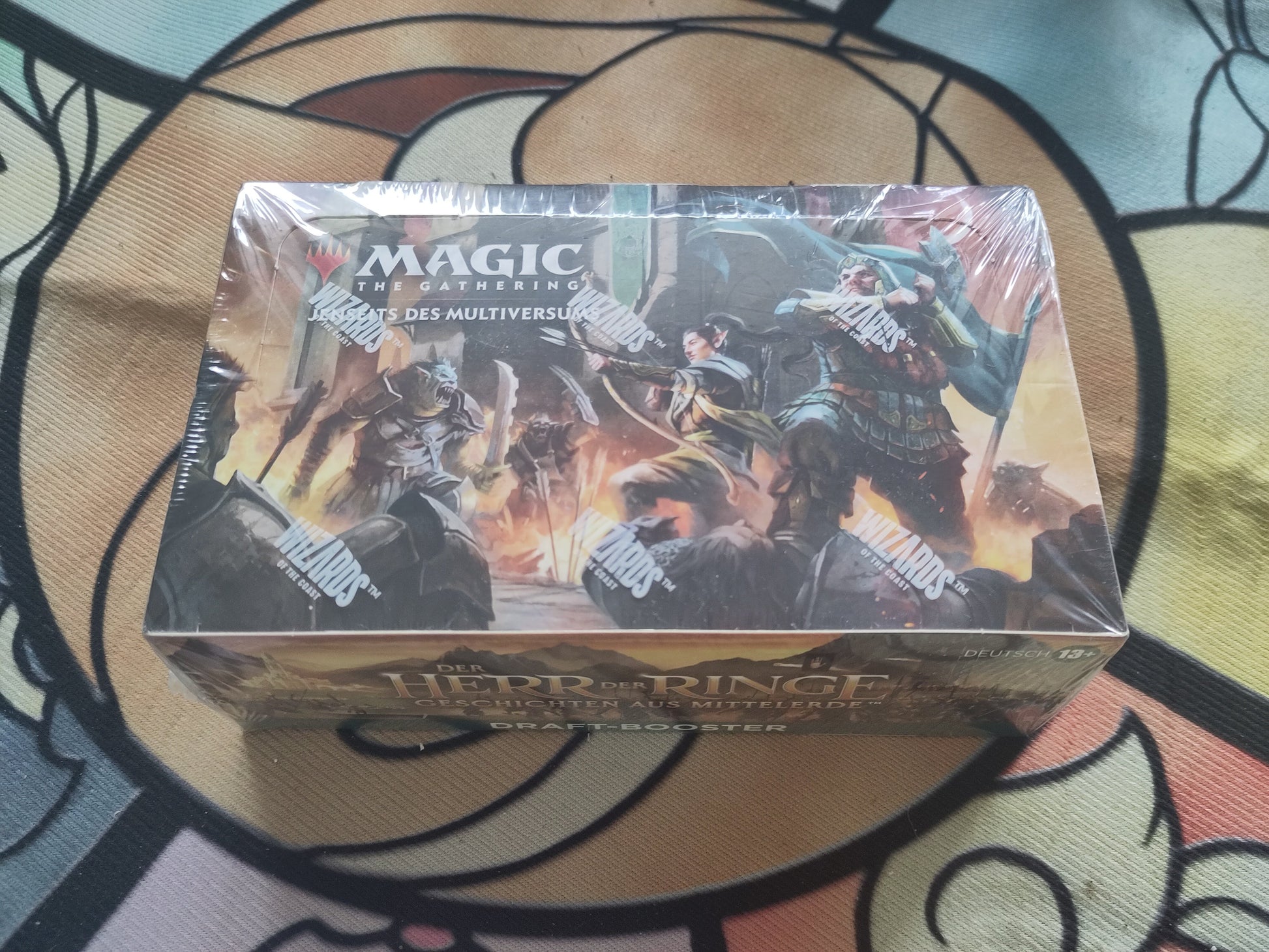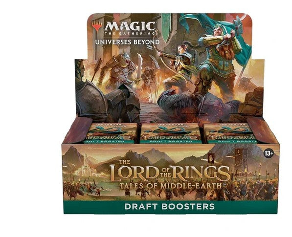 The Lord of the Rings: Tales of Middle-earth Draft Booster Box contains 36 The Lord of the Rings: Tales of Middle-earth Draft Boosters and 1 Traditional Foil Box Topper card. Each Draft Booster contains 15 cards and 1 token/ad card or Helper card, including 1 card of rarity Rare or higher and 3 Uncommons, 10 Commons, and 1 Land cards. Traditional Foil Borderless Mythic Rare card in <1% of boosters. Traditional Foil of any rarity replaces a Common in 33% of boosters.Β